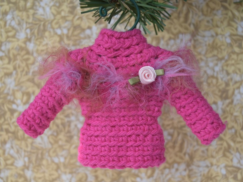 DSC_1580 Published September 27, 2018 at 3544 × 2658 in 2018, the Year I Crocheted Tiny Sweaters Sweater ornament in pink with ribbon rosette