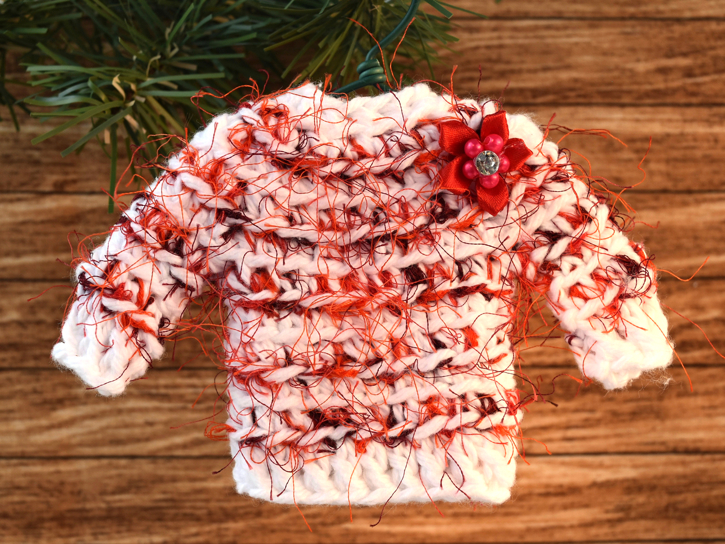 DSC_4803 Published September 27, 2018 at 3000 × 2250 in 2018, the Year I Crocheted Tiny Sweaters Sweater ornament in red and white with a ribbon flower