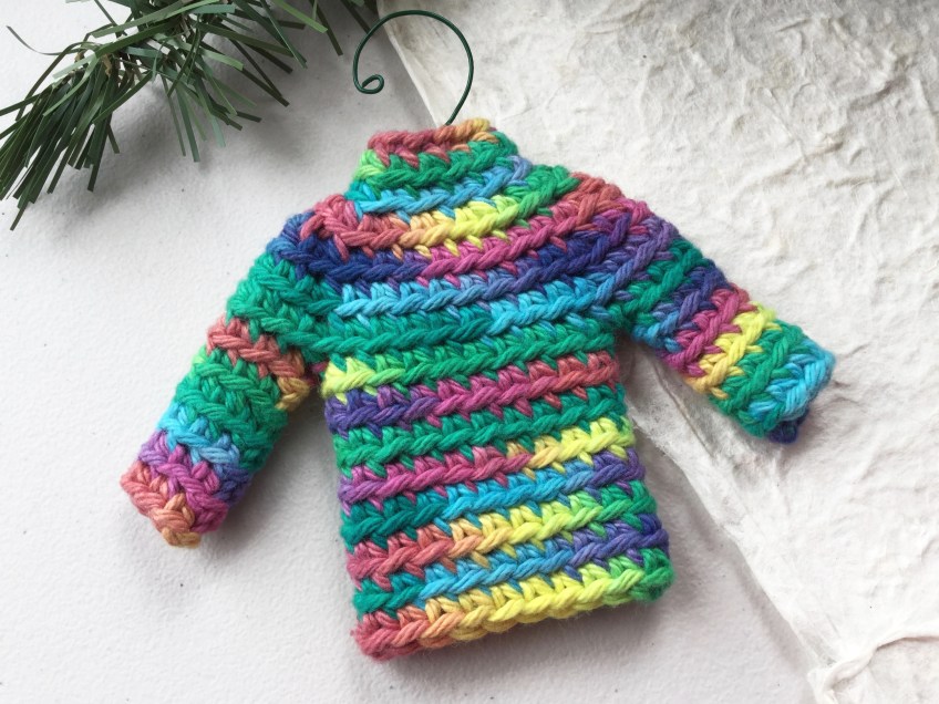 IMG_0788 Published September 27, 2018 at 2921 × 2191 in 2018, the Year I Crocheted Tiny Sweaters Sweater ornament in mixed rainbow colors