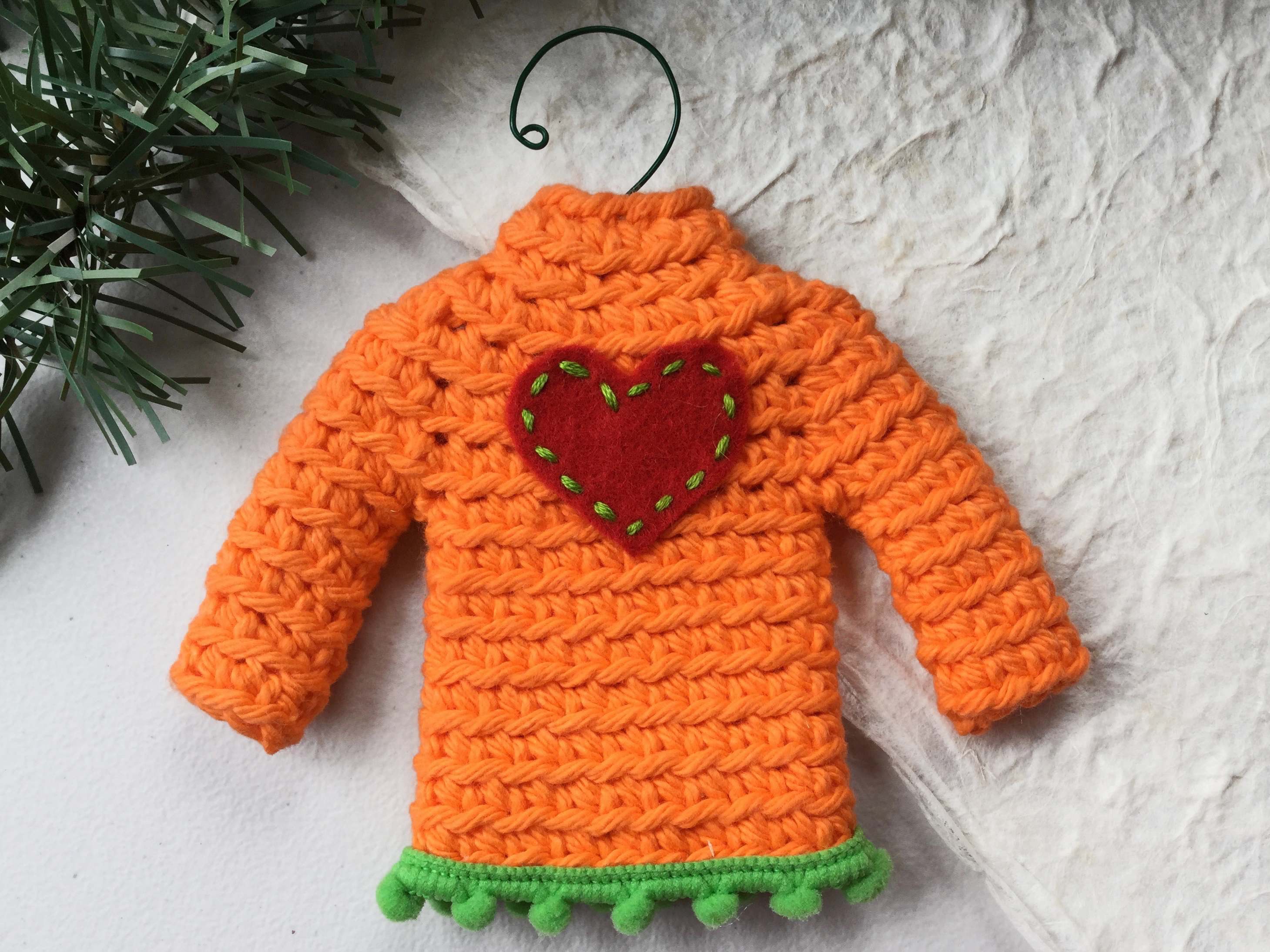 IMG_0837 Published September 27, 2018 at 2919 × 2189 in 2018, the Year I Crocheted Tiny Sweaters Sweater ornament in orange with a red heart and green pompoms